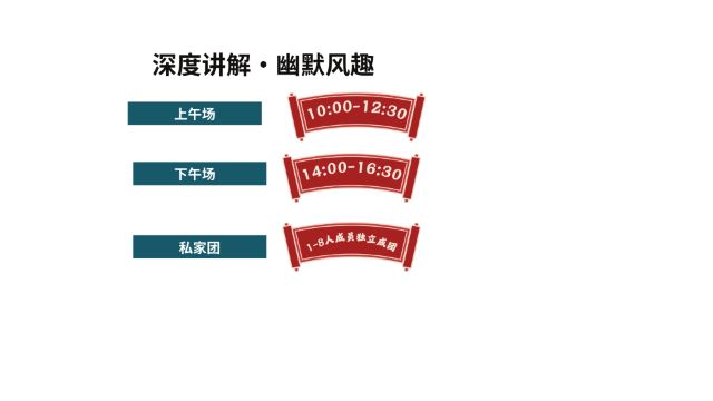 - 【时间灵活】上午场10:00.下午场14:00.沉浸式解说(最多15-25人内团)