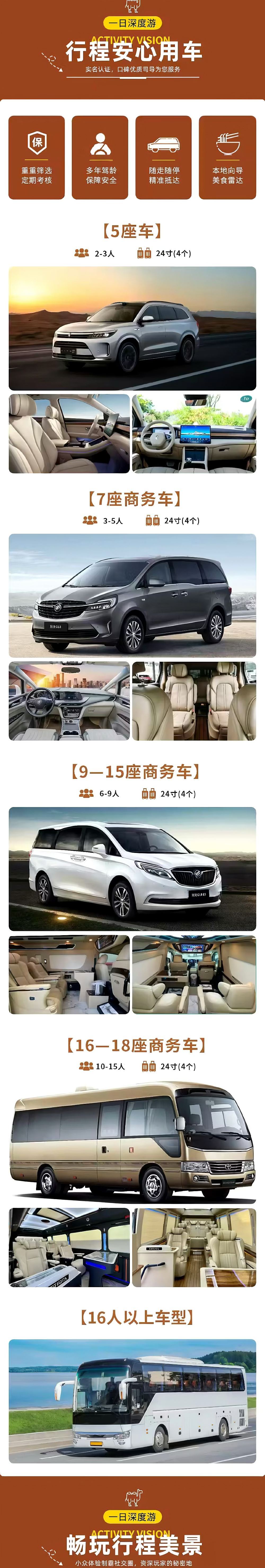 3、【参观方式】:拼车(日落班拼车为一人拼车位,按参加人数选择相应车辆,每天发车有7座商务和15座九龙商务)