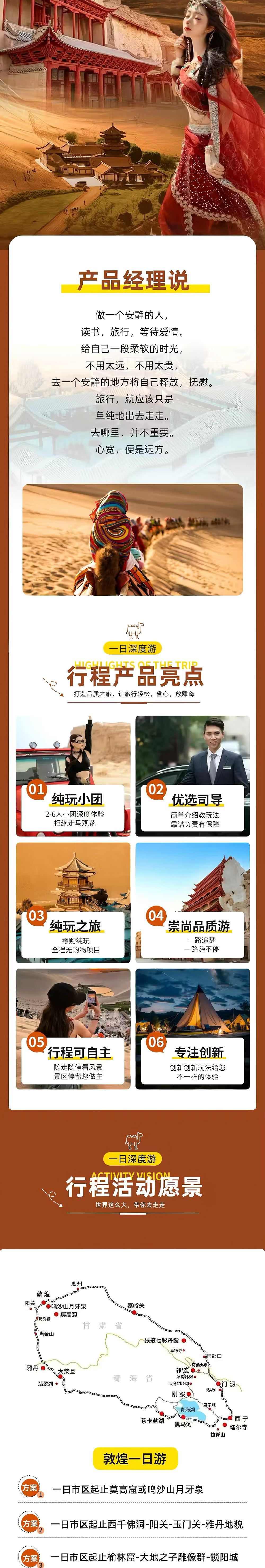 9、【莫高窟+鸣沙山月牙泉拼车一日游】服务时间7:45-18:00,早上7:45市区酒店上门接,先去鸣沙山月牙泉景区(含月牙泉首道门票,观光车不含),下午13点左右去莫高窟(购买莫高窟13.30以后14点左右的场次),最后返回市区。根据人数安排车辆,请在出行前一天预约!(莫高窟门票不含,需要提前自行在小程序莫高窟参观预约网预约)