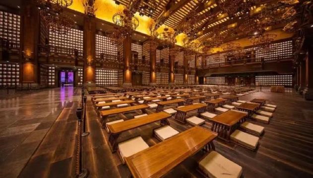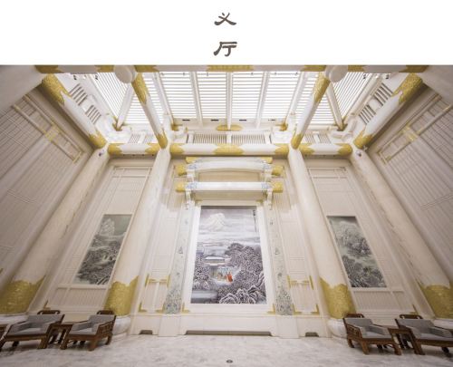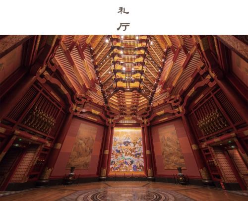 其中仁厅居中,这是一个面积达到3000平方米的巨型“课堂”,空间感受设计成为一个儒文化的图书馆。四周高大的书架一直延伸到屋顶,放满了儒家经典的古籍。中央是一列列的书案,可容纳上千人聚于一堂听一次课,抄一回经典,举行一场“五经博士”的授衔仪式。“义、礼、智、信”四个厅围绕在仁厅四周,每一个厅堂用不同的方式讲述孔子的思想。