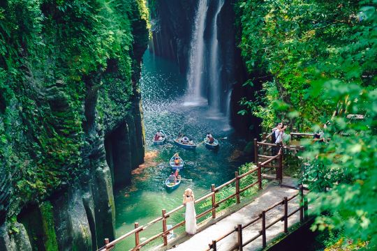 ▲ 高千穗峡:高千穗峡是由约12万年前阿苏山火山活动形成的V字形峡谷,柱状节理的岩壁雄伟奇特。峡谷内的真名井瀑布倾泻而下,景色壮丽。游客可沿步行栈道观赏,也可选择自费乘船从峡谷底部近距离感受瀑布与水岩奇观。