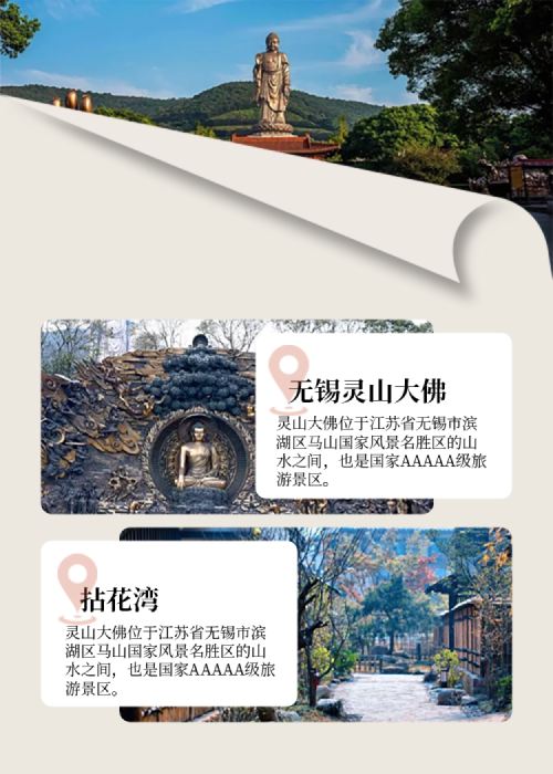 无锡灵山胜境景区,位于江苏省无锡市西郊的马山太湖国家旅游度假区内,紧邻环太湖高速和锡宜高速公路,是一座享誉海内外的“AAAAA”级大型佛教文化旅游主题景区。整个景区南临太湖,北倚群山,青龙山与白虎山分别位于其东西两侧,气势恢弘。