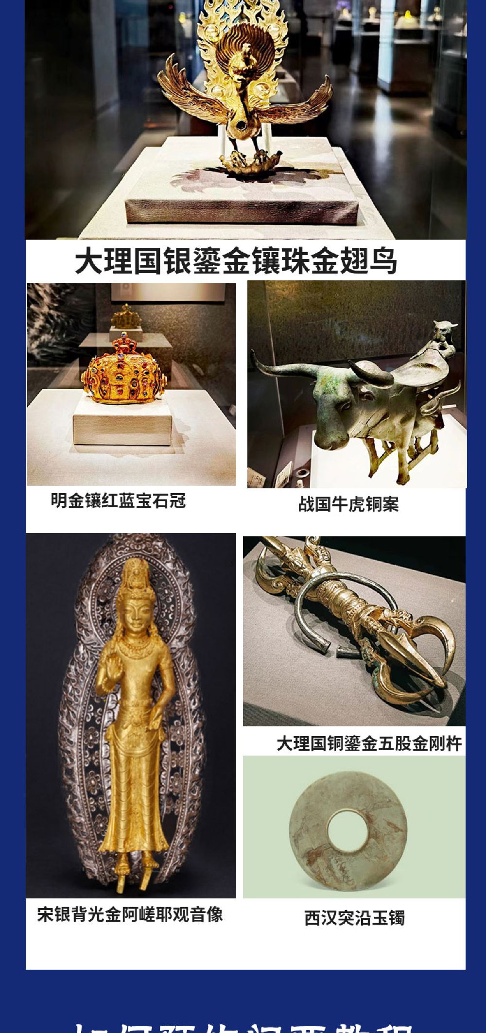(镇馆之宝)滇王之印、牛虎铜案、金镶红蓝宝石冠、四牛察金骑士铜贮贝器、银察金嵌珠大鹏金翅鸟、聂耳小提琴