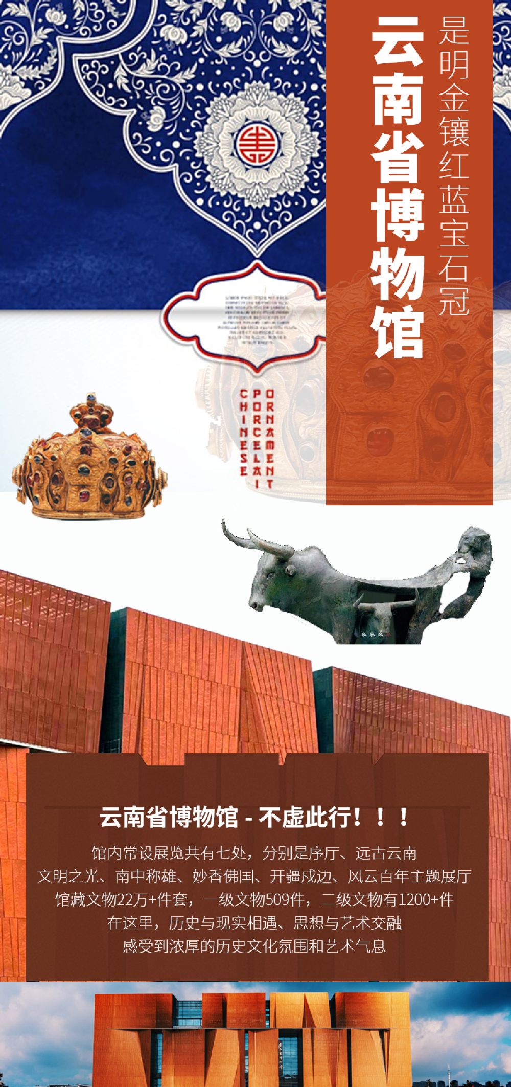 云南历史、文化、艺术聚集之地。主要有6大基本陈列《远古云南一一史前时期的云南》、《文明之光一一青铜时代的云南》、《南中称雄一一东汉至魏晋时期的云南》、《妙香佛国一一唐宋时期的云南》、《开疆戍边一-元明清时期的云南》、《风云百年一一近现代时期的云南》讲述了从古至今云南大地的悠久历史:
