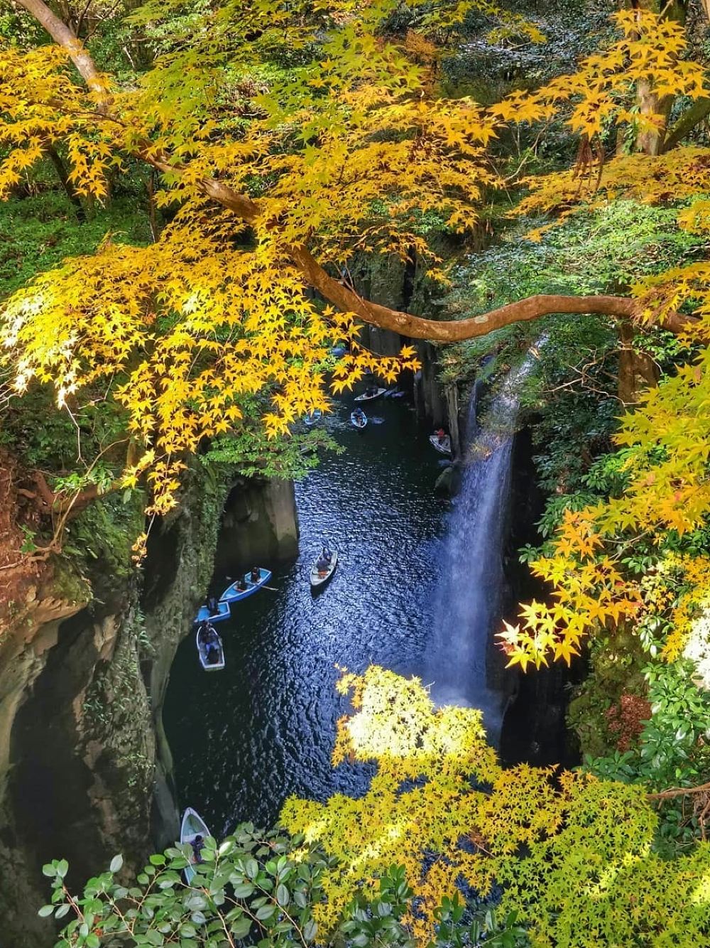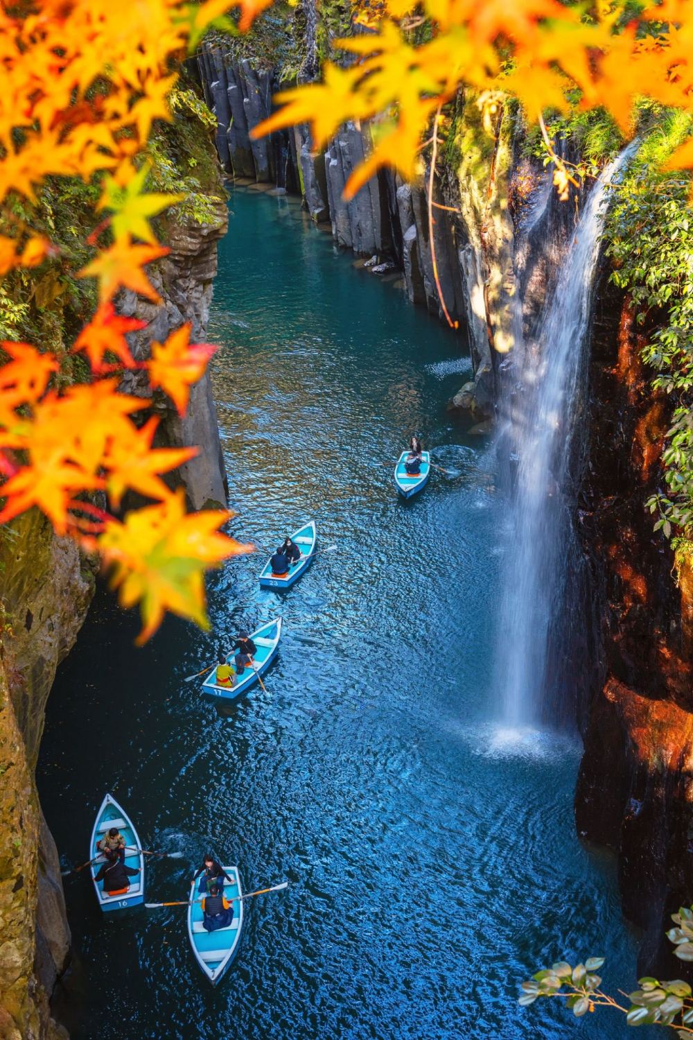 ▲ 高千穗峡:传说中天照大神隐居之地,峡谷幽深、碧水潺潺。在宁静的高千穗峡谷中,乘坐游船缓缓划过碧绿溪水,两岸峭壁间飞瀑倾泻,水雾轻拂脸庞,仿佛走入神话长卷。(一艘游船可以乘坐3人)