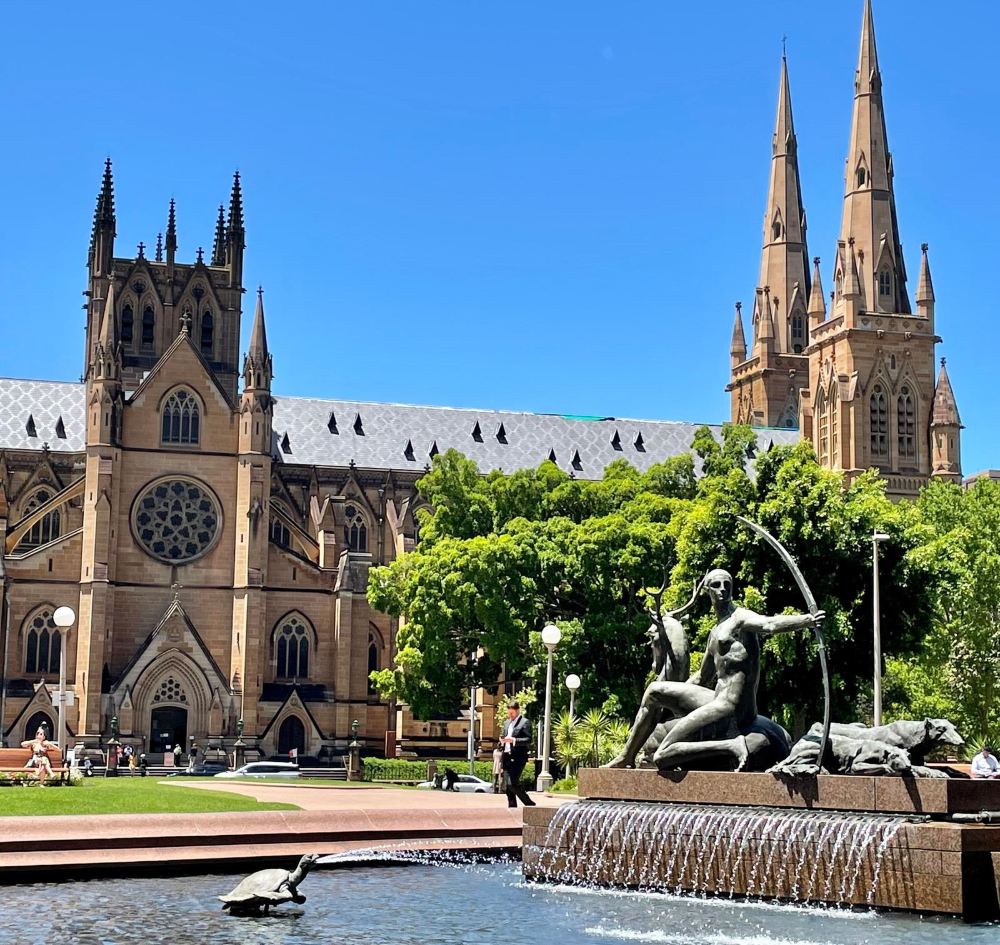 ▲ 圣母主教座堂始建于1821年,而天主教神父正式来到澳大利亚是在1820年,因此圣母主教座堂又被称为澳大利亚天主教堂之母(Mother Church of Australian Catholicism)。1865年修建中的大教堂毁于大火。重建工程于1865年开始,耗时60多年,于1928年完成。1998年至2000年,加修教堂的尖塔。大教堂长107米,中殿24.3米宽,天花板高22.5米,教堂的双塔是悉尼的地标,中心塔高46.3米,前塔和尖塔的高度为74.6米。