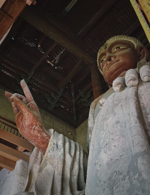 ▲ 大佛寺是中国历史上的烈士纪念堂,初名应福寺,北宋仁宗时改名庆寿寺,明代以来俗称大佛寺。大佛寺石窟依山凿窟,雕石成像,分为大佛窟、千佛洞、罗汉洞、丈八佛窟和修行窟五部分。大佛窟是全寺的核心,高31米,开凿于唐武德元年(618年),贞观二年(628年)完工,主尊阿弥陀佛倚崖居中,高20米头高 5.2米,东西两侧分别是大势至菩萨和观世音菩萨,均身高17.6米,神态恬静。千佛洞内有造像 696尊,后人推测大部分是武则天时期作品。