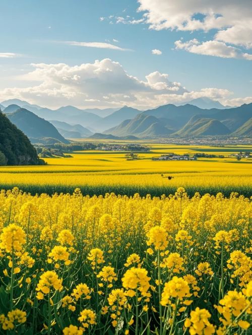 ▲ 玉垒关下,油菜花海与青山碧水相拥,绘就冬日里的金色梦幻画卷。