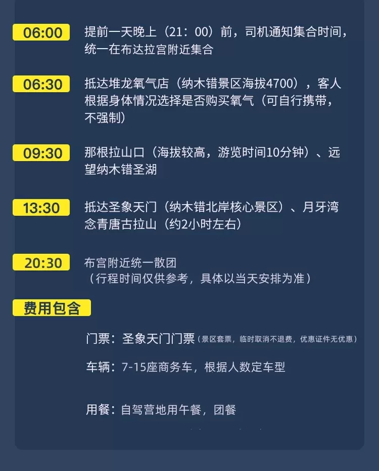 1. 由于纳木错景区天气不稳定,如因雨雪天气封山导致无法进入景区参观(是否能进景区以当天景区通知为准,恕无法提前告知)只退未产生费用,已产生车费不退!2. 本行程由于海拔较高,暂不接待66岁以上老人以及7岁以下儿童报名,如果隐瞒年龄下单,司机有权请客人下车,所产生的损失客人自行承担!敬请知晓!3. 请带小孩客人,小孩按照成人价格支付,如果支付不了请联系客服,请不要隐瞒有小朋友出行并且私自带上车,如果导致没有空座,所有产生的损失客人自理,敬请知晓!4. 氧气袋属于易爆物品,严禁携带!!!!