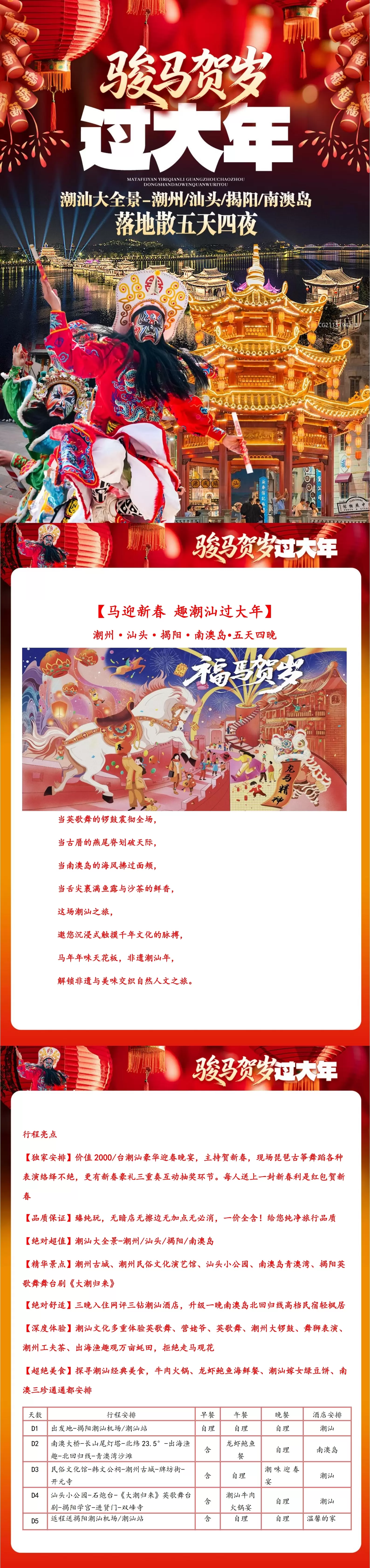 潮汕过大年丨潮州+汕头+揭阳+南澳岛5日纯玩丨大潮归来舞台剧【潮汕风味迎春晚宴+英歌舞+接送机+出海+下午茶】