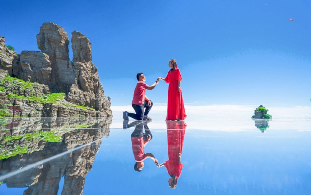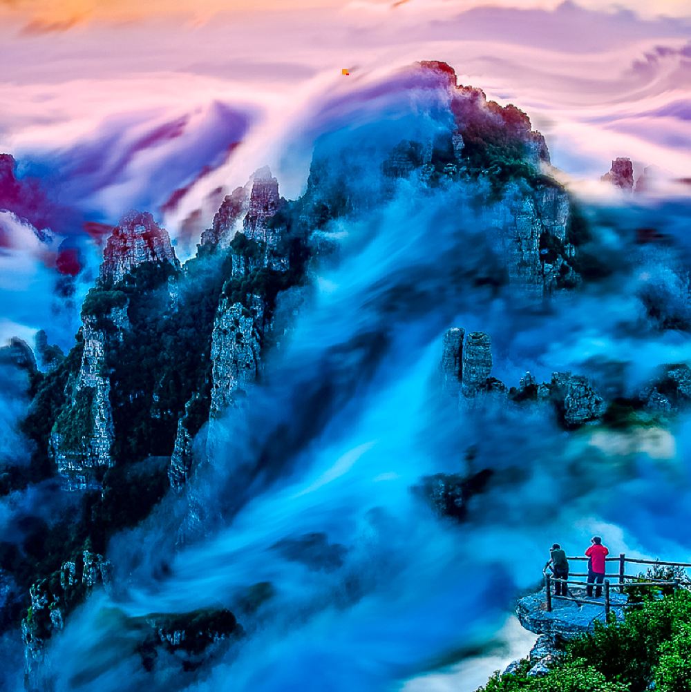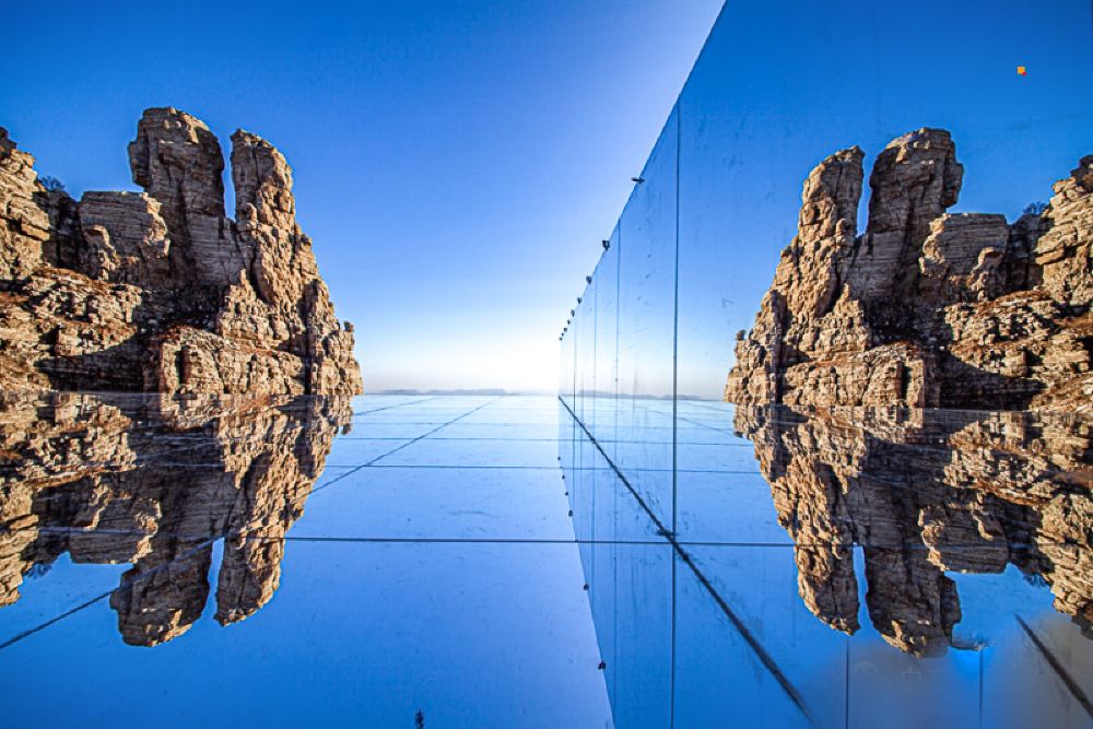 是继玻璃栈道之后,景区再次倾力打造的网红产品,位于白石山海拔1900米游览线双雄石观景平台上,占地面积400余平。“天空之境”顾名思义是嵌入白石山的人间镜子,单向透视玻璃结合特殊涂层盖底,加上侧面立镜形成合围之势,达到更为立体的效果,既没有折射,也没有散射,360度美景均可完整地倒映在镜面上,清晰透亮,如梦似幻。一个人站立在玻璃上,可发现左右及脚底有三个相同的自己,与美景相互映衬,画面极有意境。