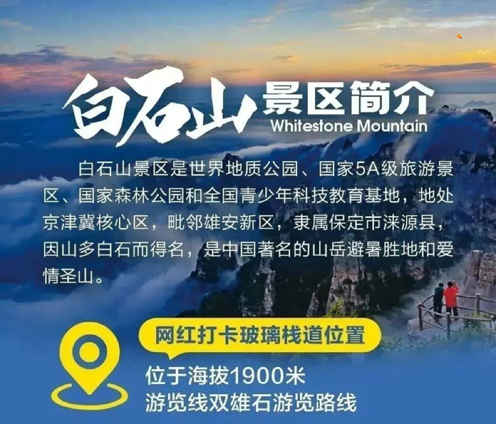- 11:00|到达白石山景区,大家乘坐缆车/摆渡车到达山顶,在云端赏太行之首美景,看奇山怪石,中午云间午餐时间,尽情享受;下午继续欣赏美景,喜欢摄影的尽情创作,三步一景,五步成诗,十步入画,百步不胜在人间。