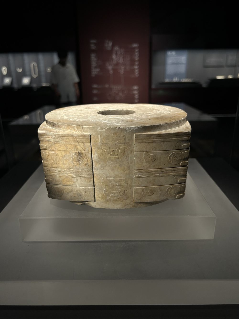 ▲ 玉琮王:高逾九节,重若千钧,通体透闪石凝脂生光。神徽密码:四面直槽内,微雕“神人兽面纹”凛然生威;羽冠天神驭猛兽,双目如炬,线条细若游丝却纤毫毕现,0.1毫米浅浮雕暗藏良渚信仰的终极图腾。五千年前长江流域的“王权天授”,在此轰然觉醒。