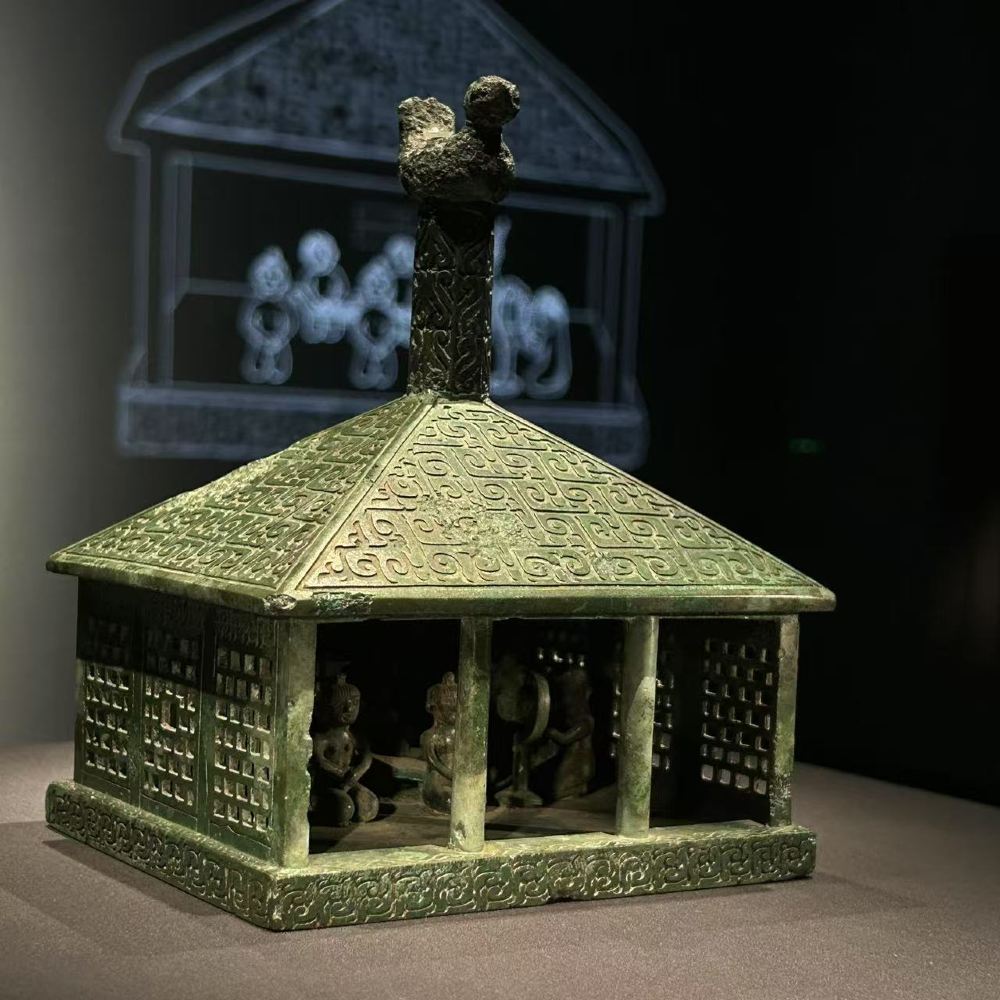 ▲ 伎乐铜屋:战国青铜瑰宝,以17厘米微缩殿堂凝固礼乐盛景。榫卯飞檐悬山顶,六乐俑跪坐奏响鼓、琴、笙,歌者昂首似楚音绕梁。0.3毫米青铜薄壁一体铸成,失蜡法铭刻2400年前江南匠魂。展厅内顶光倾泻,铜屋投映巨型“影子剧场”,乐俑随光摇曳如复生奏乐,编钟古曲萦绕耳畔。方寸之间,战国贵族“钟鸣鼎食”的华章、干栏建筑的智慧与青铜铸造的至高工艺,于静默中轰鸣,再现先秦礼乐文明的永恒光辉。