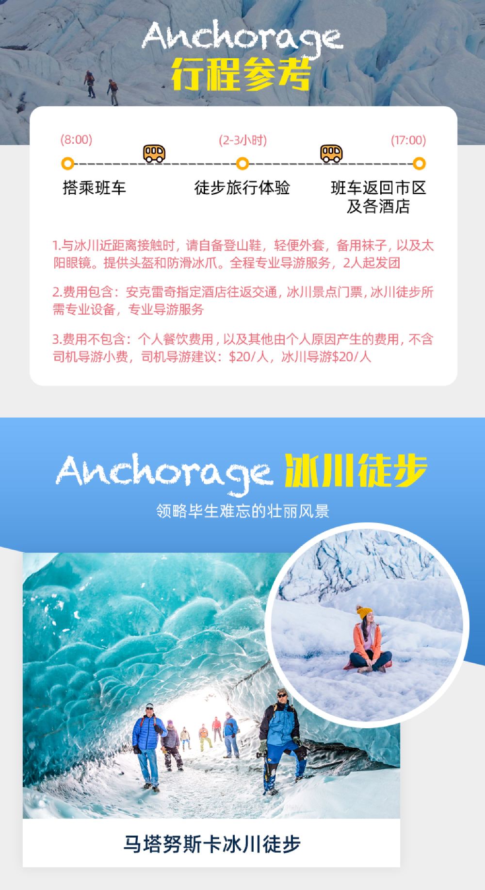 6. 费用包含:安克雷奇指定酒店往返交通,冰川景点门票,冰川徒步所需专业设备,专业