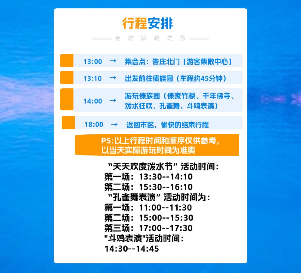 集合地点:告庄西双景北门【西双版纳城市旅游集散中心】准时出发,请根据行程时间提前10分钟候车,谢谢