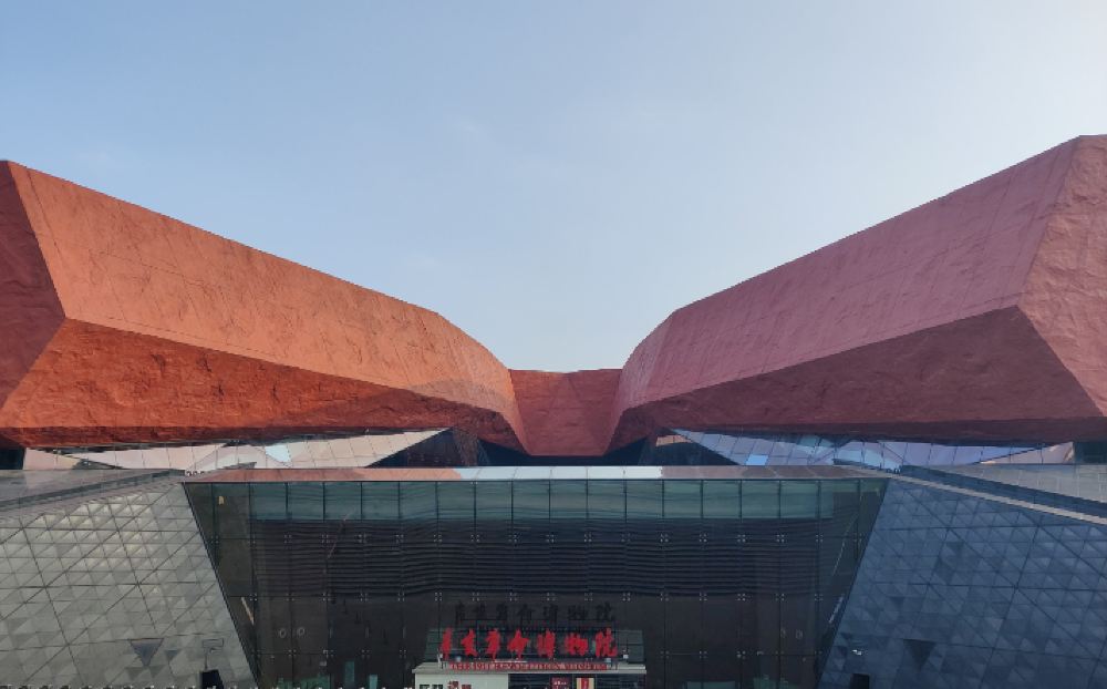 ▲ 博物馆的建筑设计独具匠心,融合了中国传统建筑元素与现代风格。其几何形外观和“楚国红”的主色调,寓意着敢为人先的首义精神,从空中俯瞰呈“V”字造型,象征着胜利和武汉的腾飞