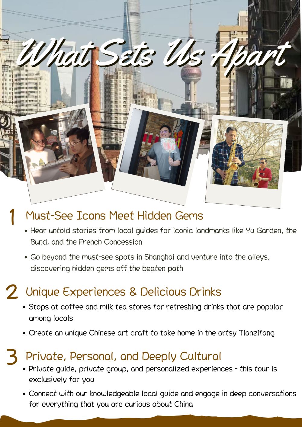 以地道的方式探索真正的上海——这并非您随手可得的体验。我们将以全新的视角,沿着精心设计的路线,探访豫园、外滩和法**等标志性地标,聆听鲜为人知的故事。在旅程中,您还将探索静谧的小巷、空旷的老城区以及大多数游客从未涉足过的当地湿货市场。沿途,您将在当地人喜爱的咖啡和奶茶店驻足,并参观艺术工作室,创作一件中国工艺品带回家。夜幕降临,您可以选择我们特色的日落体验(需额外付费),为您的完美一天画上圆满的句号。