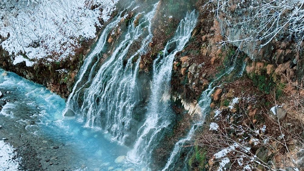 ▲ 白须瀑布, 冬季的白须瀑布如一幅水墨画,湛蓝水流从雪白崖壁泻下,两侧冰凌晶莹,雾气蒸腾如仙境。