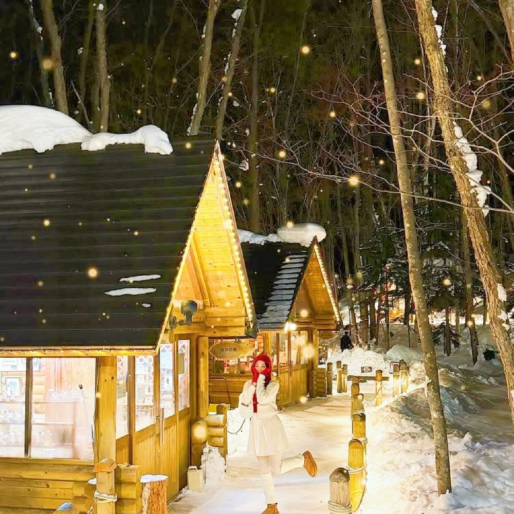 ▲ 12月:森林精灵露台(平日前往)/ 拓真馆(红日子前往) 位于富良野森林中的童话小木屋聚落,木质步道蜿蜒其间,商店里售卖手工艺品与纪念品,氛围静谧梦幻,是漫步与拍照的好去处。 (由于精灵露台11月3日-11月28日设施维护无法参观,变更为男山酒造资料馆游玩30分钟,可免費品尝日本清酒1杯。)