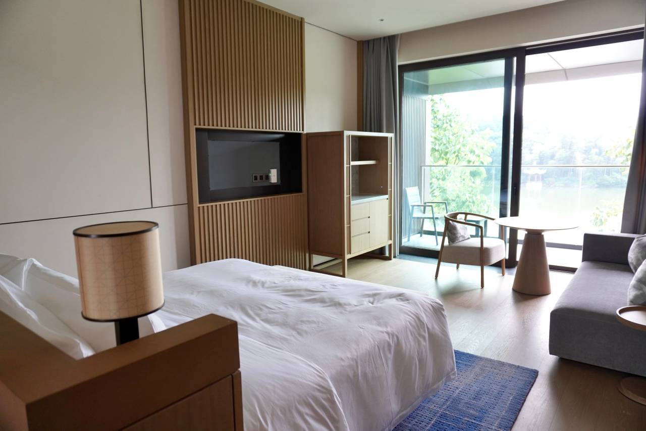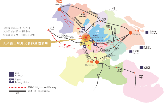 采菊东篱下,悠然见南山 长兴南山居开元名都度假酒店 酒店坐拥400亩私享北湖和南湖,优越的自然环境让你感受采菊东篱下,悠然见南山的生活意境。 范蠡是经商之道的典范,启迪着无数心怀抱负的有志之士,因而南山居也成为商业翘楚心向往之的圣地。 本酒店正坐落于典故中的湖州市长兴县,因此酒店以南山居的典故为源头,为周边度假及商务客源提供精致奢华的休憩之所,致力于将酒店打造为自信的成功精英的心悠度假之选、高净值人群私享生活的心游共鸣之选。 地理位置 酒店坐落于长兴县煤山镇兴能路188号,背山面水,独居于五通山内。 距离长兴站30公里,约40分钟车程 距离长兴南站24公里,约30分钟车程 距离宜兴站35公里,约50分钟车程 距离上海市区205公里,约2.5小时车程 距离杭州市区143公里,约2小时车程 距离南京市区约153公里,约2小时车程 客房 酒店客房沿湖而建,依山而起,拥各式客房、亲子房及套房共计154间。 突破传统空间设计,将简约新中日式风格设计手法融入其中,强调人文情怀和民族文化。 观湖大床房