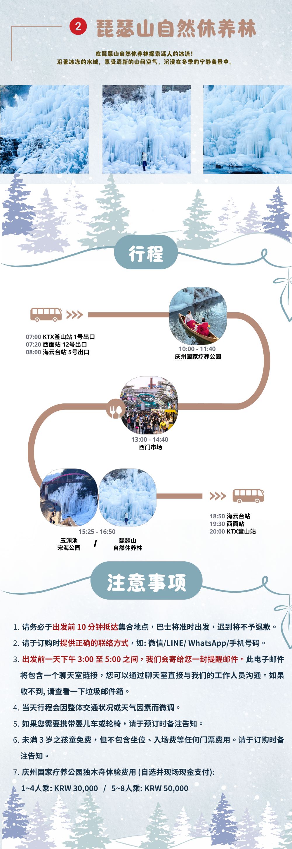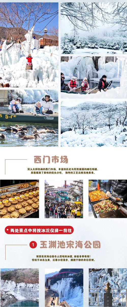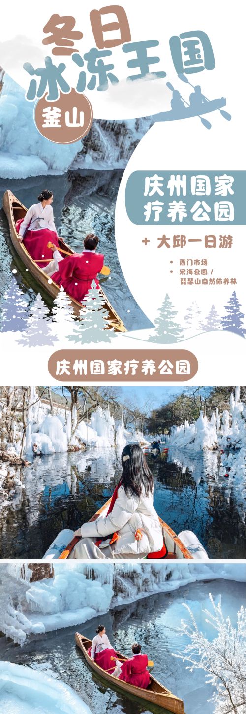 庆州国民疗愈公园+大邱冰冻仙境+西门市场日游 (釜山出发)【庆州国家疗养公园|白雪覆盖的仙境,可体验雪橇、独木舟和冰川步道,拥抱冬季魅力,创造难忘回忆。】