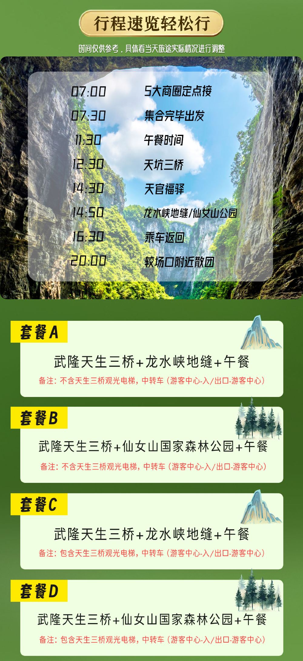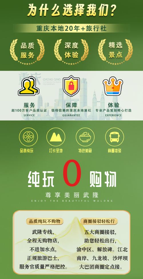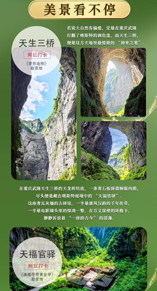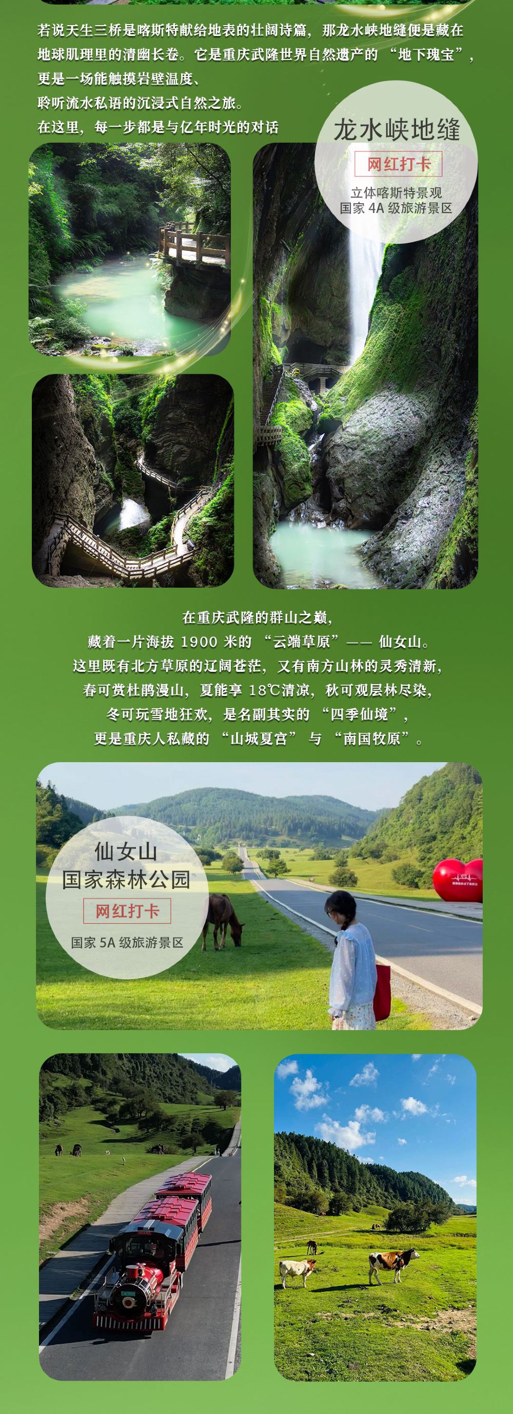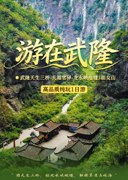 重庆武隆天生三桥+龙水峡地缝或仙女山公园纯玩一日游【〖纯玩大团〗往返大巴+门票+景区换乘车电梯(选或不选)+特色竹笼宴午餐+导游服务,主城五大商圈接驳;】