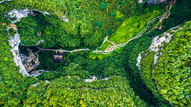 ▲ 天坑里的神秘宁静加上谷底的天福官驿像极了仙侠小说中的的世外桃源,这里非常适合拍武侠风,建议可以准备一套古装和道具