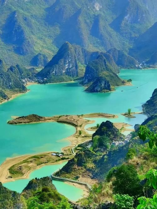 凌云县下伶镇的高山湖泊,湖水碧蓝如翡翠,被群山环抱,设有环湖骑行道和徒步栈道,可体验划桨板等项目,云汉峰、对弈峰等景点如诗如画。