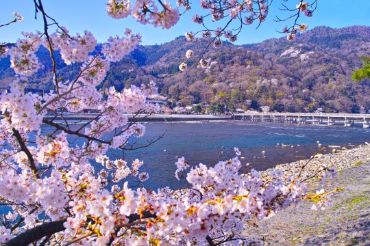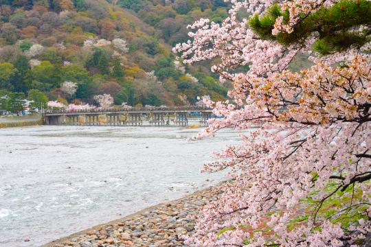 ▲ 13 世纪,后嵯峨天皇将吉野著名的樱花树迁移至此,使该地区成为赏樱胜地 这里全年都有阳光照耀,彩色的阳光洒在山坡和岚山竹林上方,看起来浪漫而迷人