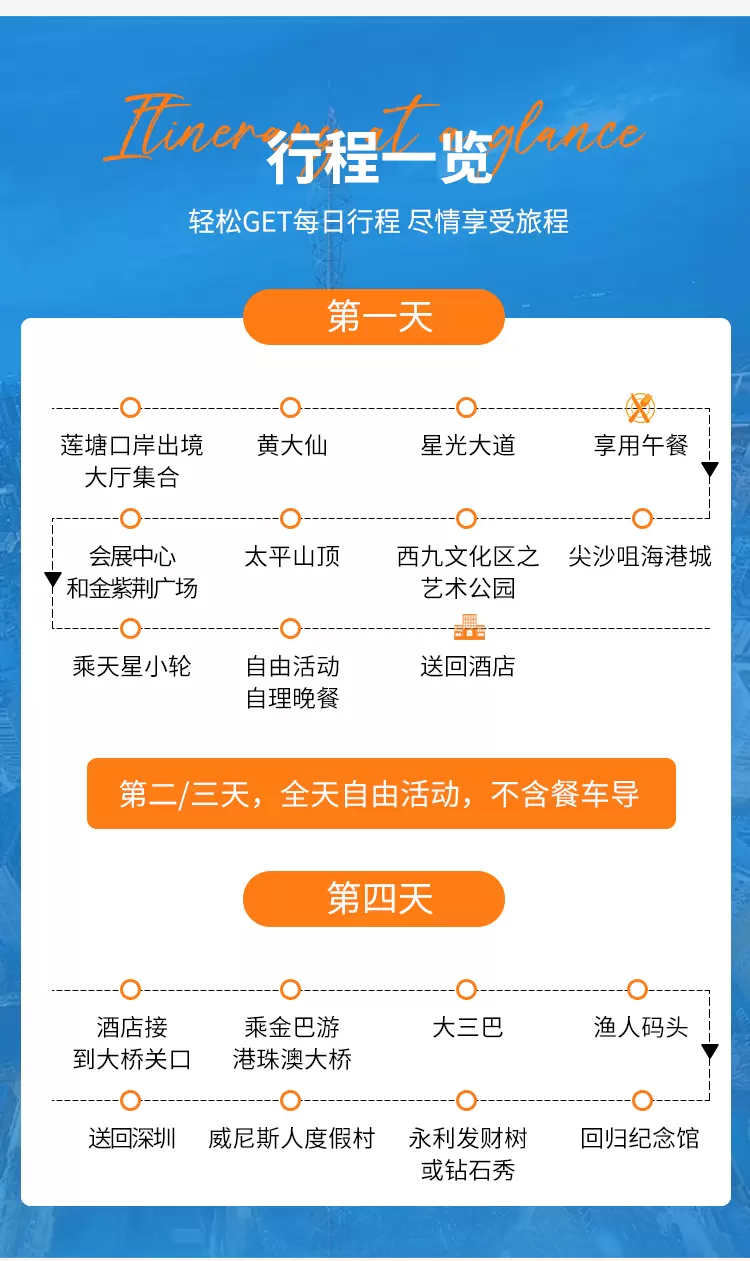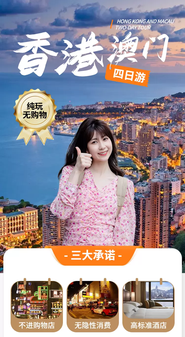 香港澳门四日游【纯玩无购物店·2天自由行·住香港三钻酒店·深圳往返】