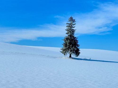 ▲ 不可错过的莫过于独立美瑛町雪原之中的圣诞之树啦!形态精致,宛如一颗标准圣诞树,扎根在茫茫白雪覆盖的大地中,艺术感十足,吸引了很多游客前来打卡。