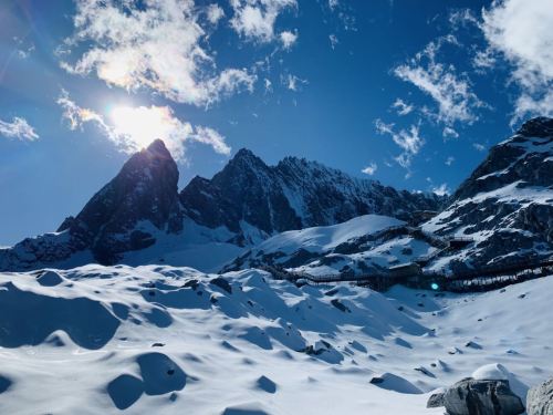 ▲ 在彩云之南的滇西北高原,玉龙雪山巍峨耸立,如一条巨龙腾越飞舞。它是北半球近赤道终年积雪的山脉,十三座雪峰连绵不绝,山顶冰雪皑皑,在阳光下闪烁着银色光芒。