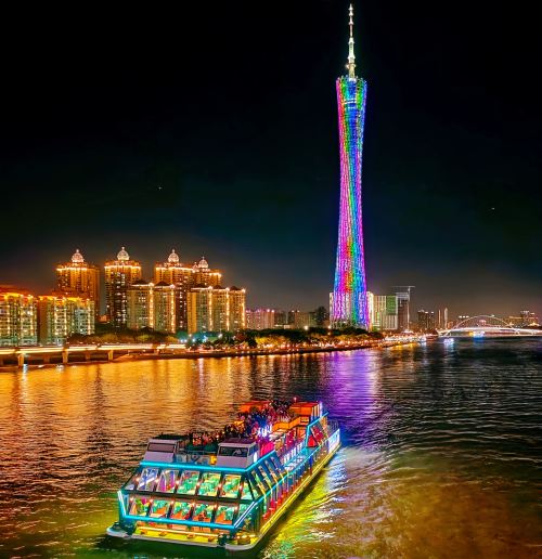 夜幕降临,城市焕然一新。您将登上一艘舒适的珠江夜游船,沿着平静的水面缓缓前行,广州的天际线在璀璨灯光秀中熠熠生辉。地标桥梁与霓虹闪烁的建筑如广州塔和广州歌剧院倒映在江面上,为您的一天画上真正梦幻而浪漫的句点。