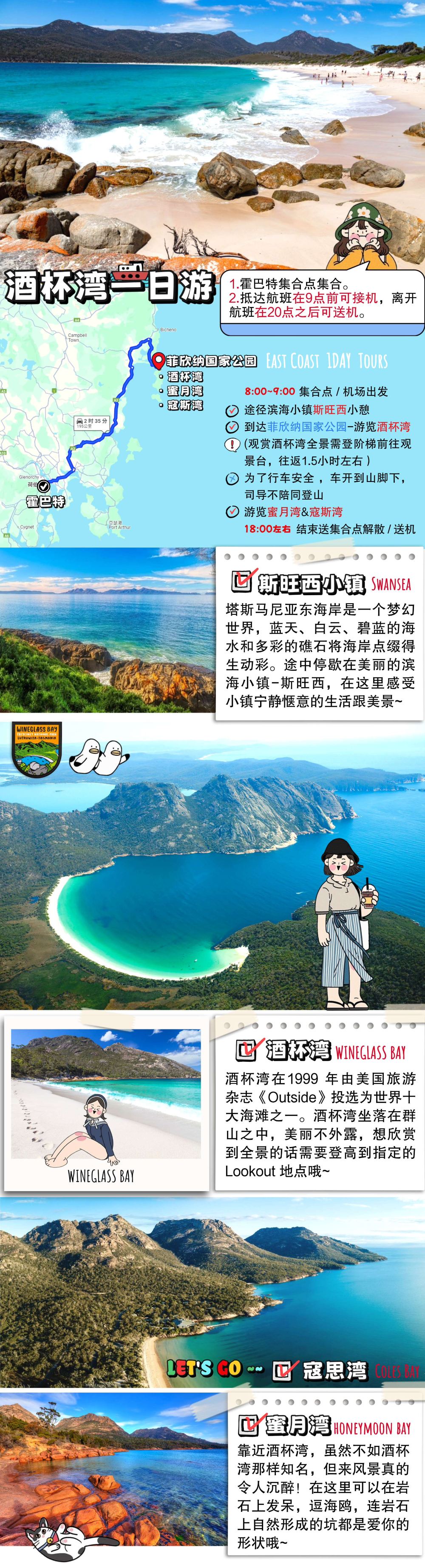 塔斯马尼亚霍巴特菲欣纳国家公园酒杯湾蜜月湾寇思湾一日游【塔斯马尼亚东海岸是一个梦幻世界,蓝天、白云、彩色的海水和多彩的礁石点缀海岸】