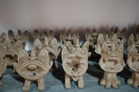 ▲ 瓦猫样子似虎类猫,选取的是虎和猫身上凶恶,有代表性的那部分。其原意是能食“鬼”的老虎。民间一般在建新房的时候将瓦猫安放在正房屋脊的正中间,背对院落,面向远方,凝视苍穹。从前只是置于屋顶的瓦猫,董志明制作的瓦猫如今成了萌宠摆件,无论是放在办公室还是房间,都是一道亮丽的风景线,当然啦,主要的还是它寓意很好。