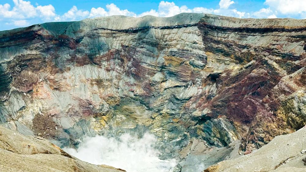 ▲ 阿苏火山口|聆听地球的呼吸与脉搏——硫磺烟柱从巨坑深处奔腾升腾,翡翠色火山湖在熔岩焦土上灼灼生辉,每道蒸汽的震颤都是大地原始的呼吸。镜头横扫间,荒芜山脊与碧湖烟云碰撞出外星地貌的震撼张力。阿苏山火山口硫磺味较重,对气味较敏感者可携带口罩。登顶须自费搭乘接驳车,往返1400日元。
