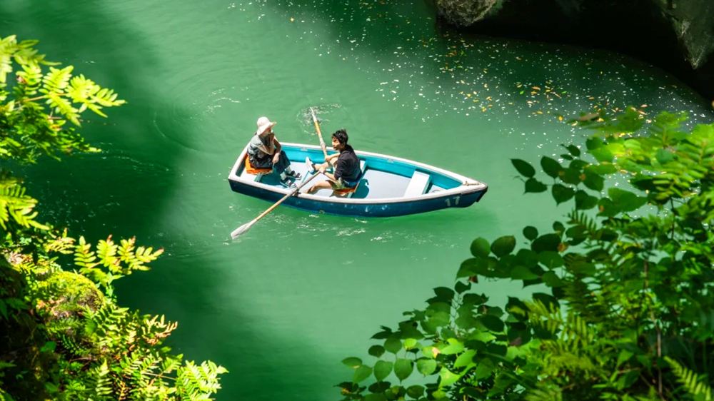 ▲ 高千穗峡谷|秋日的高千穗峡,红叶漫山遍谷,清澈的溪水倒映层林,瀑布飞流直下,仿佛把秋色点缀得更为灵动。真名井瀑布自17米熔岩断崖倾泻,水雾漫过青苔岩柱,每一帧都是自然雕琢的浮世绘