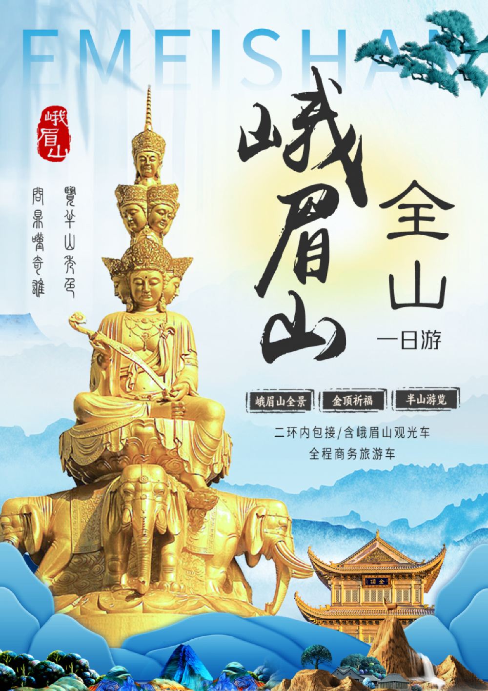 1、午餐后乘坐万年寺单程索道至千年古刹万年寺,参观无粱砖殿,游“峨眉山镇山之宝”—普贤菩萨骑象的青铜塑像