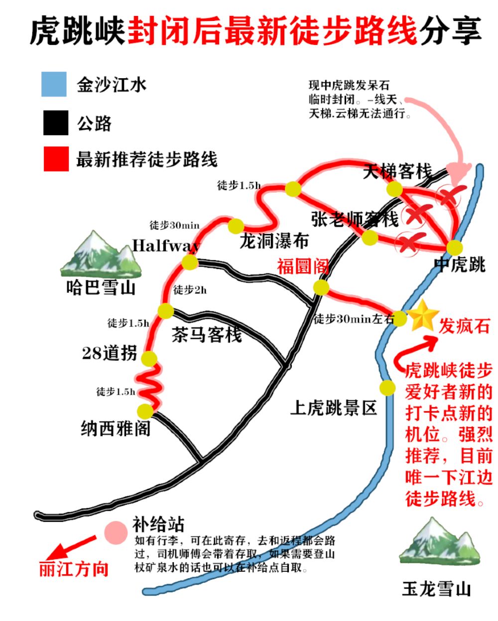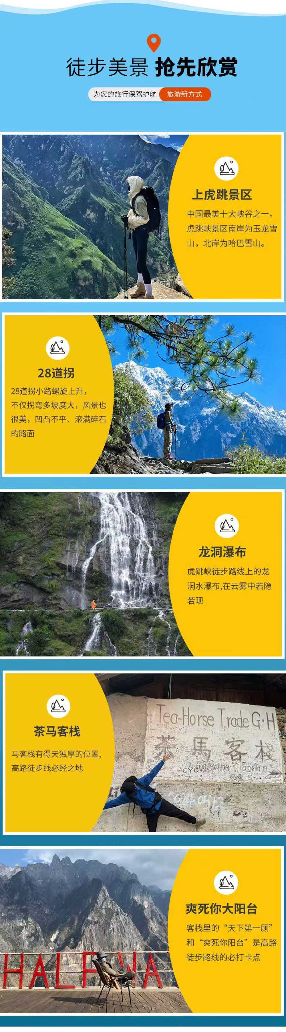 2、中虎跳坐我们的专线车不需要门票,不去上虎跳风景区就不会产生门票费用,专线车点对点发车,可选下车点有上虎跳风景区,纳西雅阁,茶马客栈,中途客栈,返程固定上车点为张老师客栈