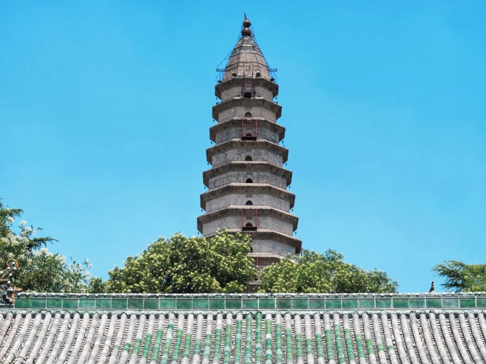 ▲ 龙兴寺始建于唐,现存主体建筑为元代以后复建。龙兴寺大殿为元代遗构,内现存三世佛及胁侍菩萨九尊彩塑,塑于金代,为宋金彩塑之精品,世所罕见。龙兴寺内所存唐高宗时期所建碧落碑,为古文书写之碑文,被誉为中华汉字演交史之见证。寺内龙兴寺塔原为唐塔,清乾隆年间重包以外皮,并由八级增至十三级,可攀登。