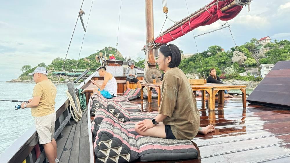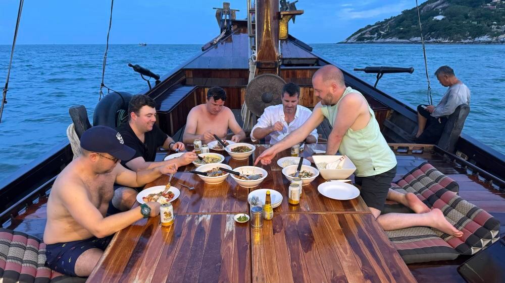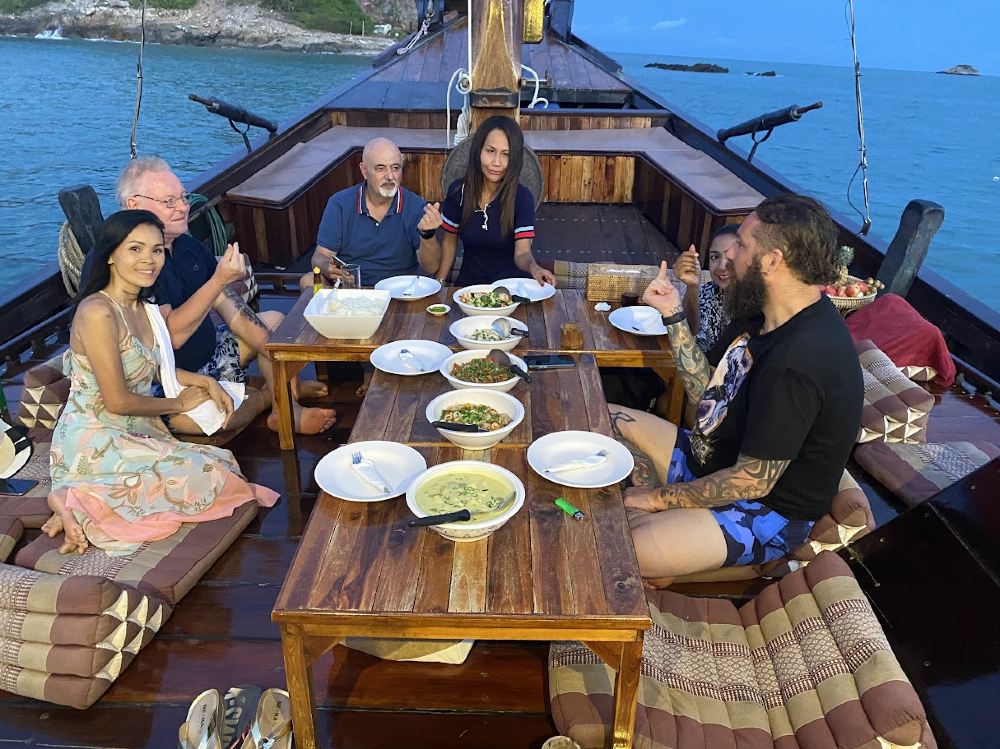 夕阳西下,天空染上金色和柔和的粉色。在这令人屏息的时刻,船上供应包含五道传统泰式菜肴的自助餐。在露天用餐,欣赏海景,每一口都令人回味无穷。地道的泰式风味、习习海风和落日余晖交相辉映,共同打造了一场难忘的晚餐体验。