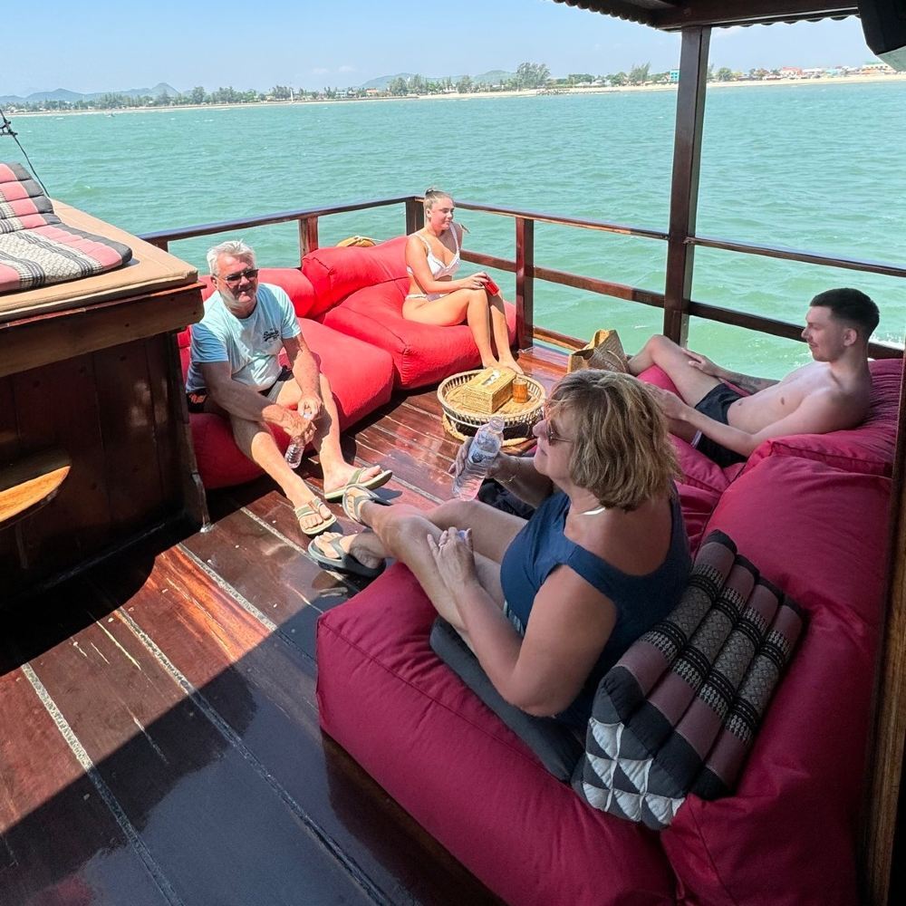 乘坐一艘海盗风格的帆船,沿着华欣海岸线乘风破浪,欣赏落日余晖,每一刻都饱览迷人景色,感受习习海风,体验探险的乐趣。旅程从私人码头出发,首先是一段平稳的巡航,驶向华欣的南岸。第一个亮点是考塔基亚布(Khao Takiab),一座金色的佛像矗立在海岸山丘之巅,俯瞰着大海。当船只缓缓驶过时,悬崖和佛像在变幻莫测的天空映衬下,构成了一幅**的画卷。