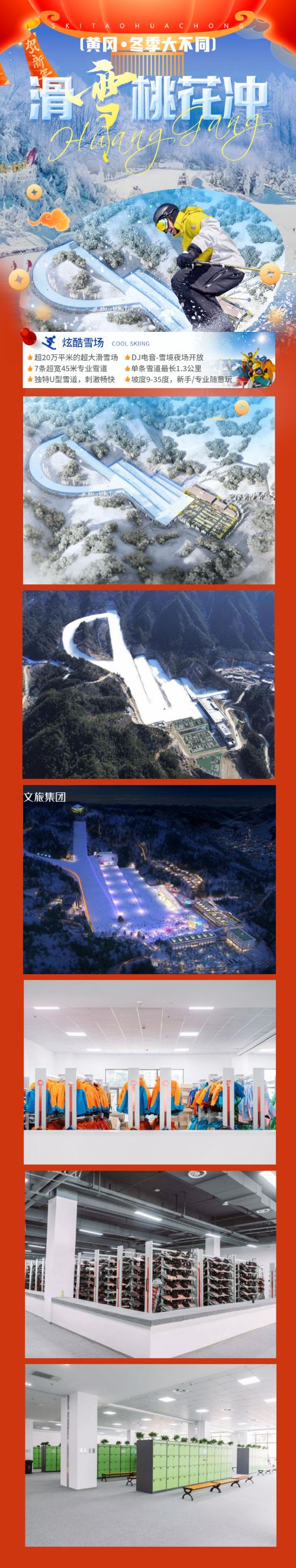 ▲ 上午武汉指定地点集合出发,前往黄冈市英山县。车赴【英山桃花冲滑雪世界】(车程约3小时,) 自行中餐,开始我们的激情滑雪体验。在滑雪场内体验滑雪乐趣,也可以欣赏俊美雪景,千里冰封,万里雪飘。英山桃花冲滑雪世界 位于湖北英山县桃花冲风景区内,滑雪场处于群山环绕之中,海拔高,雪场大,雪具充足,配套完善。滑雪场占地260亩,建有练习道、初级道、中级道、高级道等不同级别滑道,能够满足不同层次的滑雪爱好者的体验需求。滑雪道依照山势自然分布,跌宕起伏,极具挑战力,让游客能够感受风驰电掣般滑行的快感。