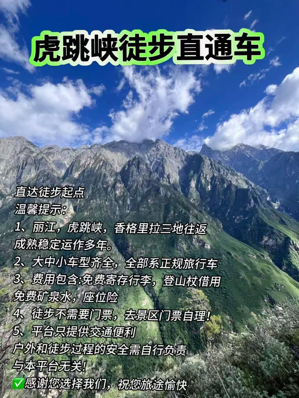 2、专线车点对点发车,纳西雅阁,茶马客栈,中途客栈,返程固定上车点为张老师客栈2026年1月25日以后返程上车点改为天梯客栈