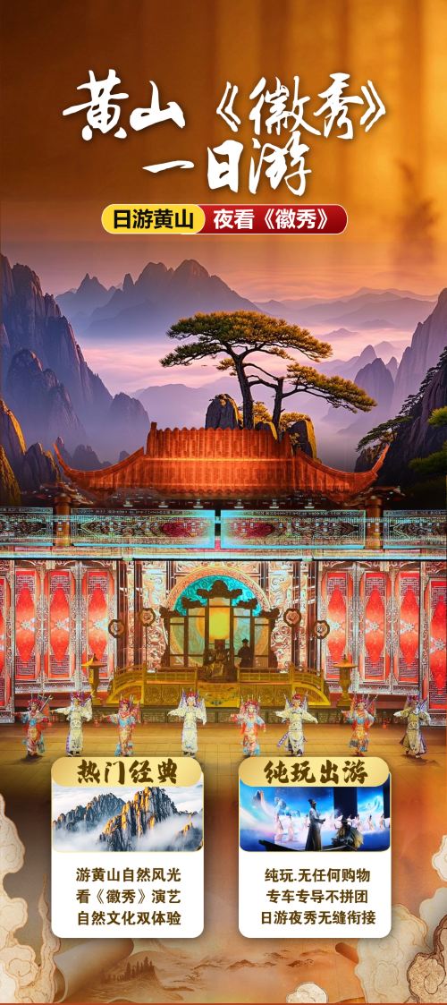 黄山+夜赏《徽秀》私家团一日游【导游陪爬+专车接送】【[导游陪爬]拒绝走马观花,看山只是山,导游带您领略“亿万年地壳抬升的风骨”。】