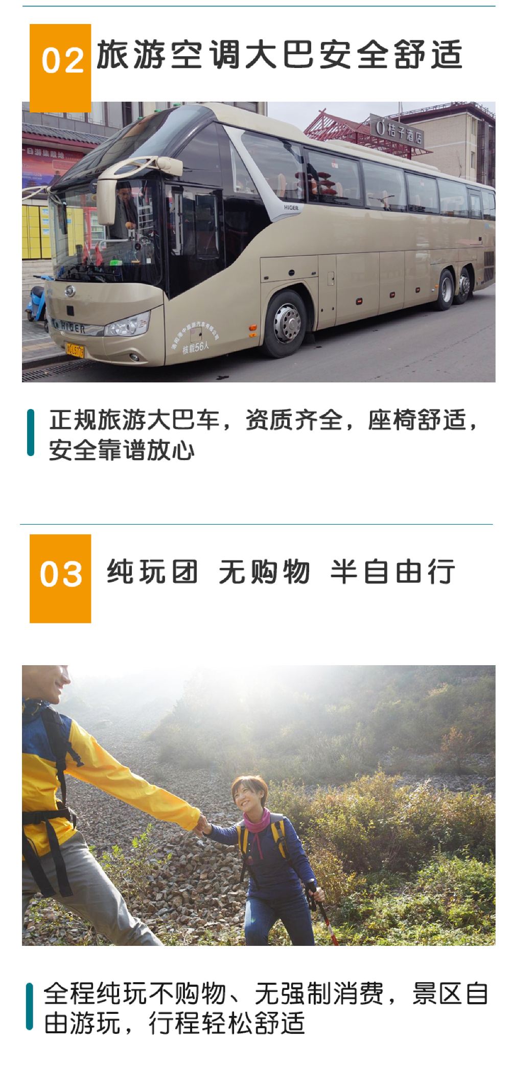 【温馨提示】淡季期间游客人数比较少,出行当天报名人数不超过17人,无导游安排,司机师傅会安排办理好门票,景区自行活动游玩。