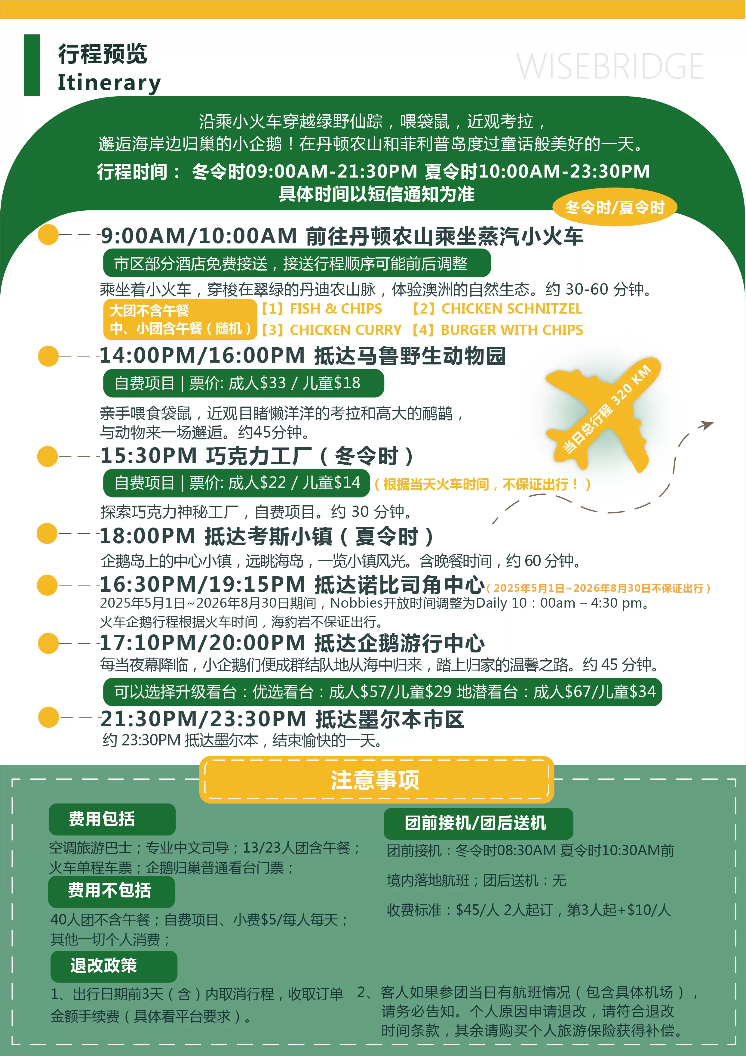 墨尔本普芬比利蒸汽火车+菲利普岛一日游【蒸汽火车(含午餐)/企鹅归巢/中文司导/天天出发】