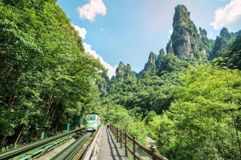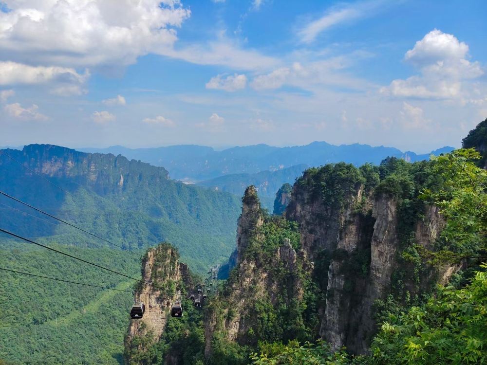 乘坐缆车优雅地从雄伟的天子山缓缓而下,您的旅程将无缝衔接到迷人的十里廊。这片令人叹为观止的风景区是大自然的杰作,巍峨的山峰与葱郁的山谷交相辉映,构成了一幅生动的中国山水画卷。