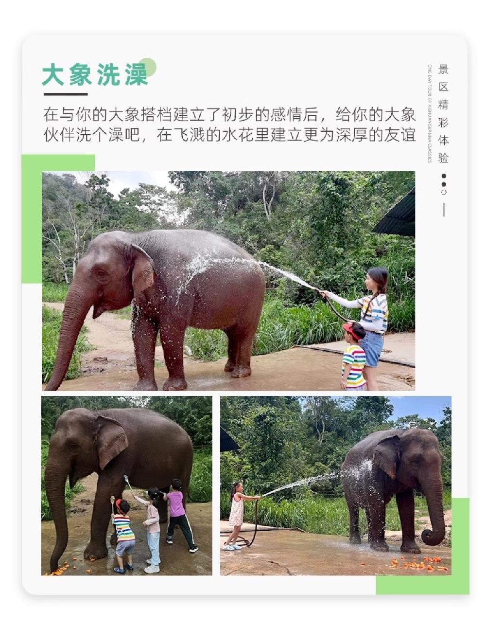 每场6-20人左右一组,行程在50分钟左右结束,先跟着象(1头象)走一段(400米左右),到喂象点排队喂象、拍照。之后人、象分开由导游带着走路出来(800米左右),途中可以看到小动物(全程与大象接触时间20分钟左右 )